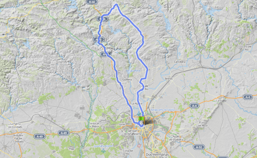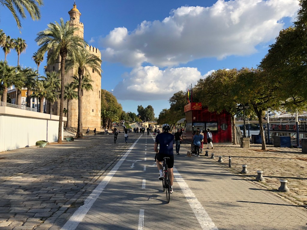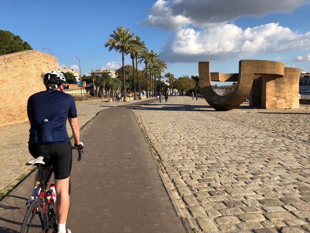 De terugweg naar Sevilla slingert even mooi door het landschap en kent nog een aardige klim (Venta del Alto). Aangezien de heenweg van 20 meter naar 470 meter boven NAP was gestegen, ging de terugweg meer omlaag dan omhoog. Omdat het landschap glooiend is, pak je toch op de terugweg de nodige hoogtemeters. Het asfalt lag er hier ook prima bij en na een snelle lunch in El Ronquillo en een windje in de rug ging de weg richting Sevilla voorspoedig. In de verte zie je de 180 meter hoge Sevilla Tower de laatste 30 kilometer, zodat je weet waar de finishstreep ligt. Aangezien het ondertussen einde middag was kwamen we steeds meer lokale fietsers tegen. Waar wij lekker met blote benen en armen reden (het was tegen de 20 graden) reden de locals in hun lange tenues en had een enkeling zelfs een muts en overschoenen aan. Uiteindelijk kom je via een groen fietspad Sevilla binnen en fiets je over de boulevard langs het kanaal richting het centrum. De boulevard was een stuk sfeervoller dan op de heenreis. De lucht was ondertussen strakblauw en op de boulevard bruiste het. Een leuke thuiskomer!