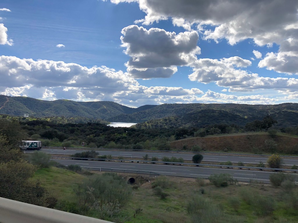 De eerste 30 kilometer tot aan Burguillos zijn ook meteen de minst mooie, waarbij je de stad uit fietst richting het noorden over een A-weg (Autoweg). Of het door het bewolkte weer kwam weet ik niet, maar het eerste dorpje wat je tegenkomt (Algaba) is niet het meest sfeervolle. Na Burguillos fiets je langzaam de heuvels in die je vanaf het begin ziet liggen en dan volgt de beloning voor de saaiere eerste kilometers. Het wegdek is hier prima en slingert over de glooiingen van het landschap. Het landschap is verrassend groen (mogelijk omdat het winter is?). Hier begint de route echt mooi en leuk te worden. Ook de wegen zijn hier rustig, dus het is heerlijk fietsen.