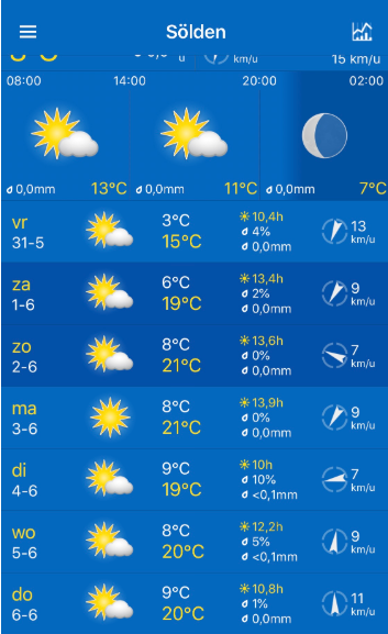 Op zaterdag 1 juni komen we aan in een stralend Tirol. We slapen in een appartement in het bergdorpje Gries, een zijtak van het Ötztal en op 20km van Sölden. Het weerbericht ziet er voor de hele week erg gunstig uit, dus het belooft een mooie week te worden.