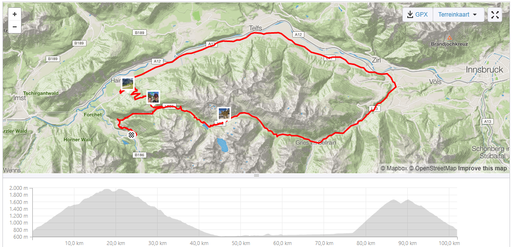Voor de 4e dag besluiten we om rondom Innsbruck wat klimmetjes te doen. Op basis van het WK wegwielrennen, de Fiets 500 en Cyclingcols.nl heb ik me laten inspireren en vooraf een ronde in elkaar geklikt. Dat de benen pijn gaat doen staat vast, aangezien er een paar behoorlijke kuitenbijters in zitten. Eigenlijk fiets je een ronde rondom Innsbruck door het dal, waarbij je op verschillende plaatsen de bergen in schiet en een beklimming doet en vervolgens deze weer afdaalt. Als er iemand in je fietsgroep een klim niet ziet zitten of tot boven op kan fietsen, dan kan hij of zij altijd onderaan de klim wachten om vervolgens samen verder te fietsen. Ideaal dus.