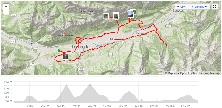 Na het afdalen van de Sagalm rijden we terug richting Innsbruck. Aangekomen in Innsbruck fietsen we tussen de sportvelden door met uitzicht op de Olympische skischans door Zuid-Innsbruck. Even later fietsen we de stad weer uit om via Götzens terug te fietsen naar Völs. We dachten dat het klimwerk voor vandaag er op zat, maar bij het uitfietsen van Innsbruck komen we op een fietspad terecht dat een paar honderd meter met 17% omhoog loopt. Daarna vlakt de weg wat af, maar in totaal klimmen we er nog zo’n 300 hoogtemeters bij. De hoogtemeters hadden van ons niet perse meer gehoeven, maar toch was het een stuk toffe route en deed het wat Limburgs aan. Geen grote bergen meer, maar leuke kleine dorpjes met wegen tussen akkers en af en toe een kuitenbijter. Eenmaal op het hoogste punt volgt een lekkere afdaling over een wat drukkere weg en voor we het doorhadden zijn we bij de auto en zit er weer een heerlijke en avontuurlijke dag op de fiets op!