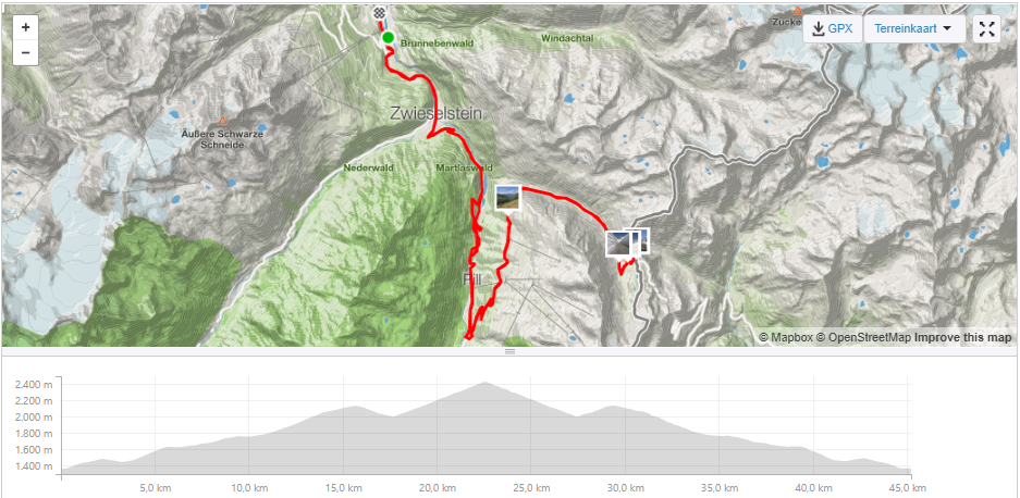 Aangekomen in Umhausen heb ik 250m geklommen door het dal (niet heel steil) en start ik aan de Niederthai. Niederthai is een skidorpje en de weg stopt daar, dus over dezelfde weg kun je weer terug naar het dal. Deze klim kent goed asfalt en fietst lekker met 4 pittige kilometers. Na het steile stuk kom ik bij een parkeerplaats waar het behoorlijk druk is en waar je naar een waterval kunt kijken. Na een korte afdaling klim ik door naar Niederthai tot het hoogste stukje asfalt wat ik kan vinden en vervolgens draai ik om om af te dalen naar het dal.