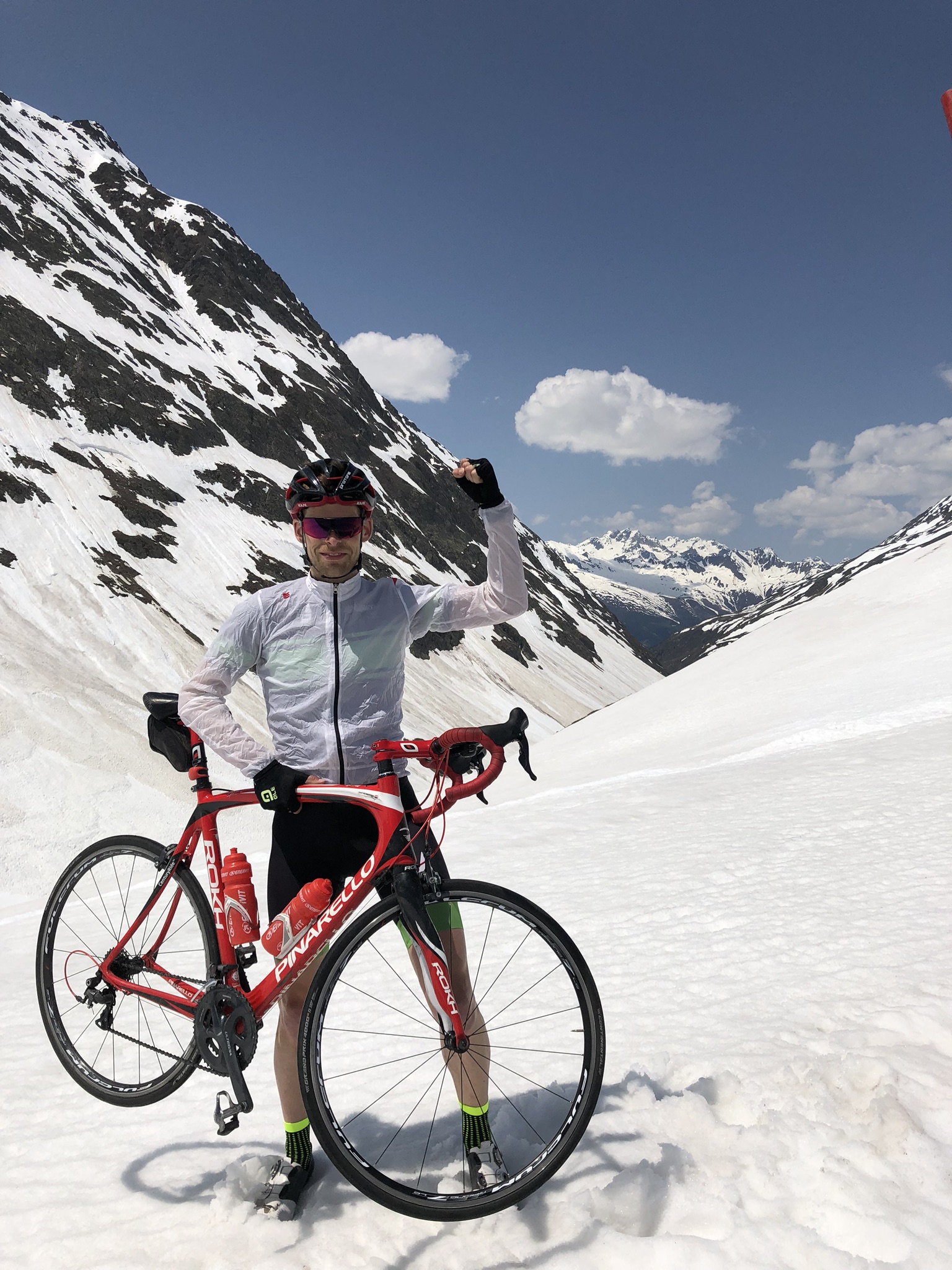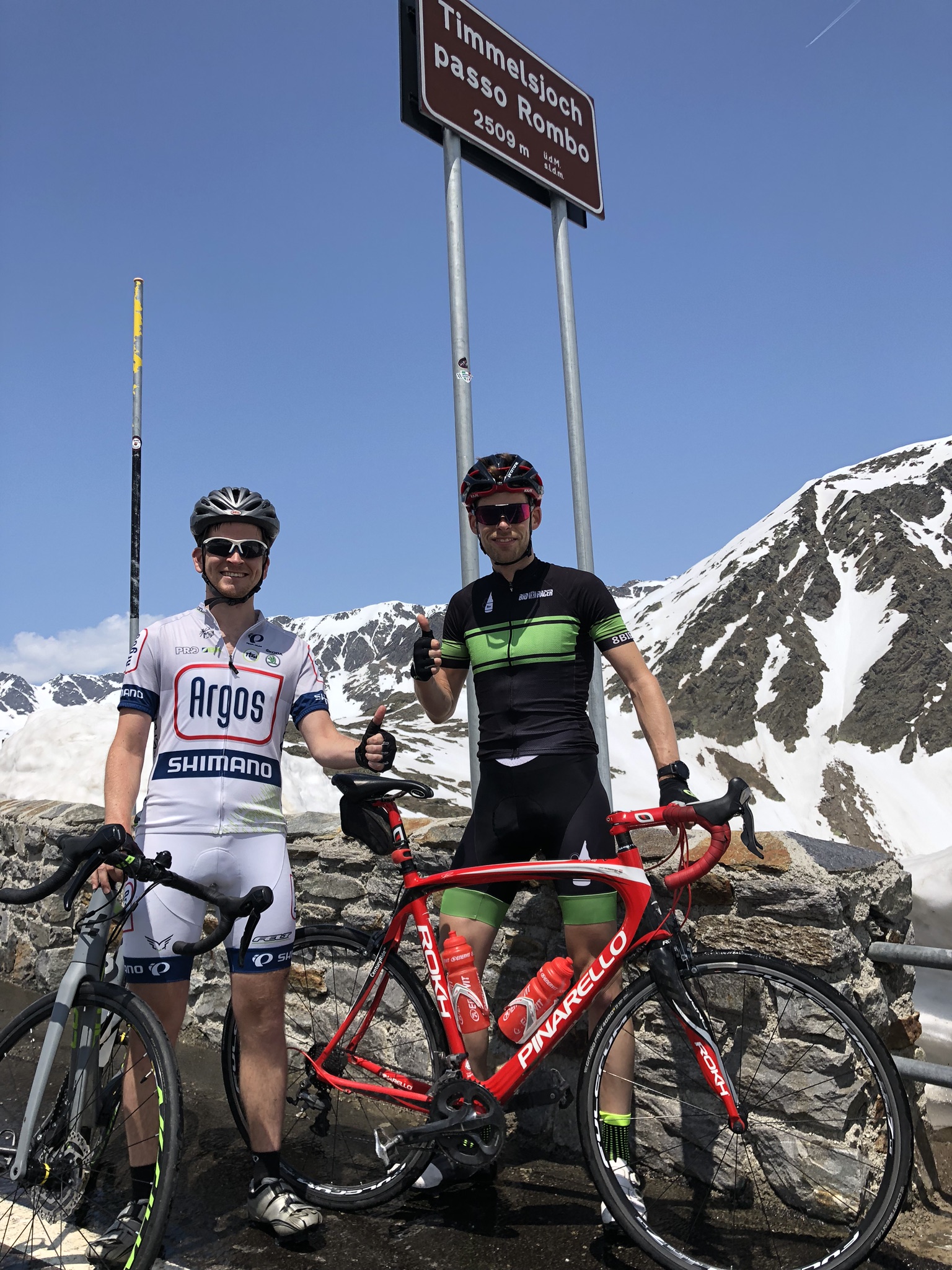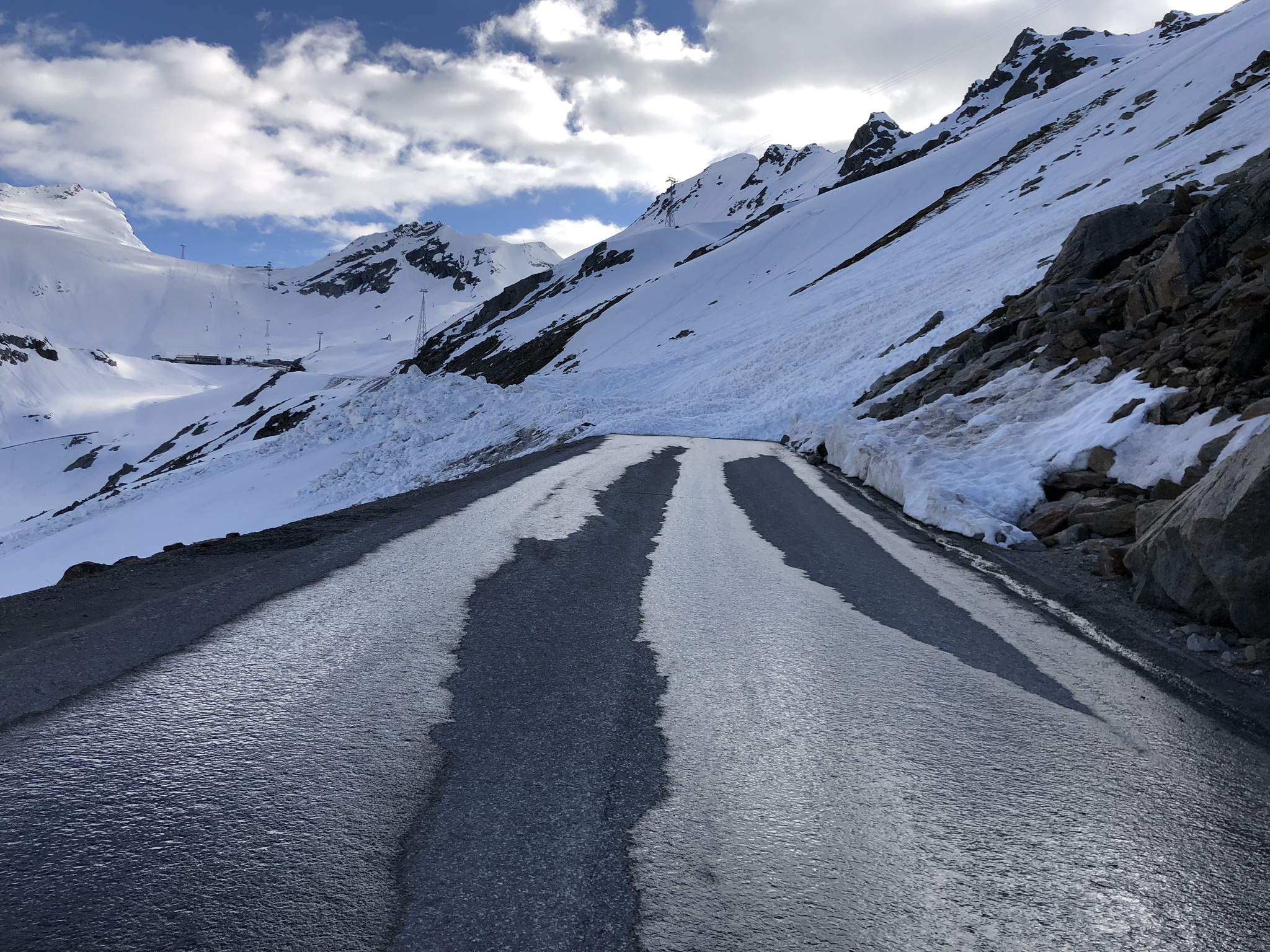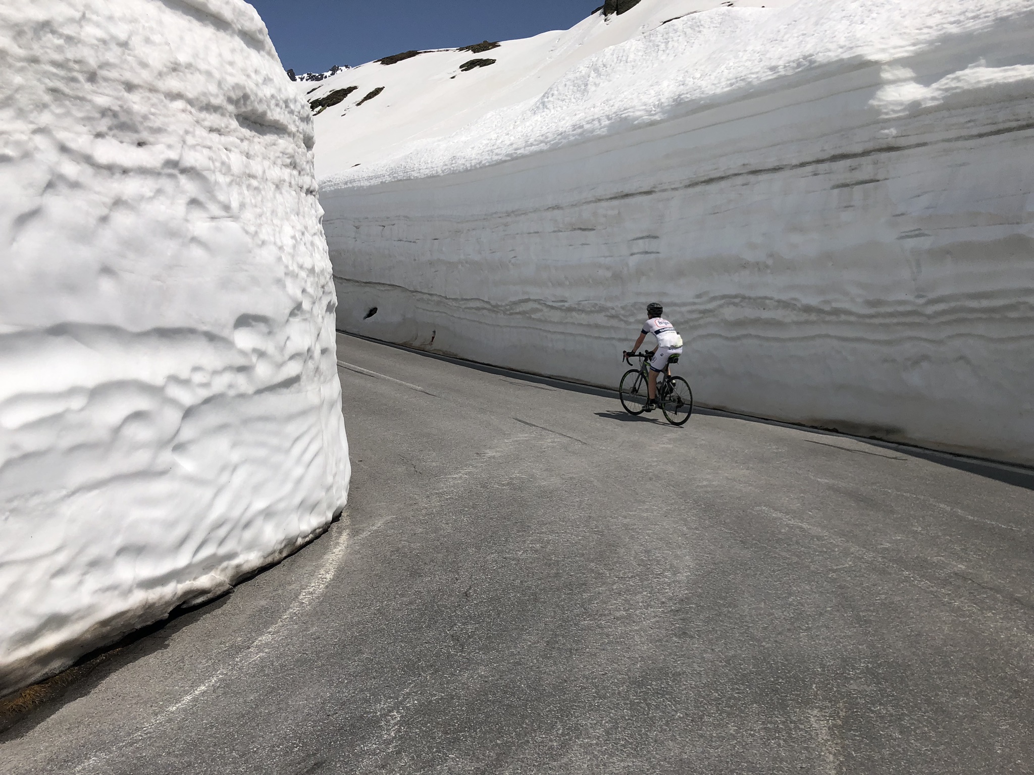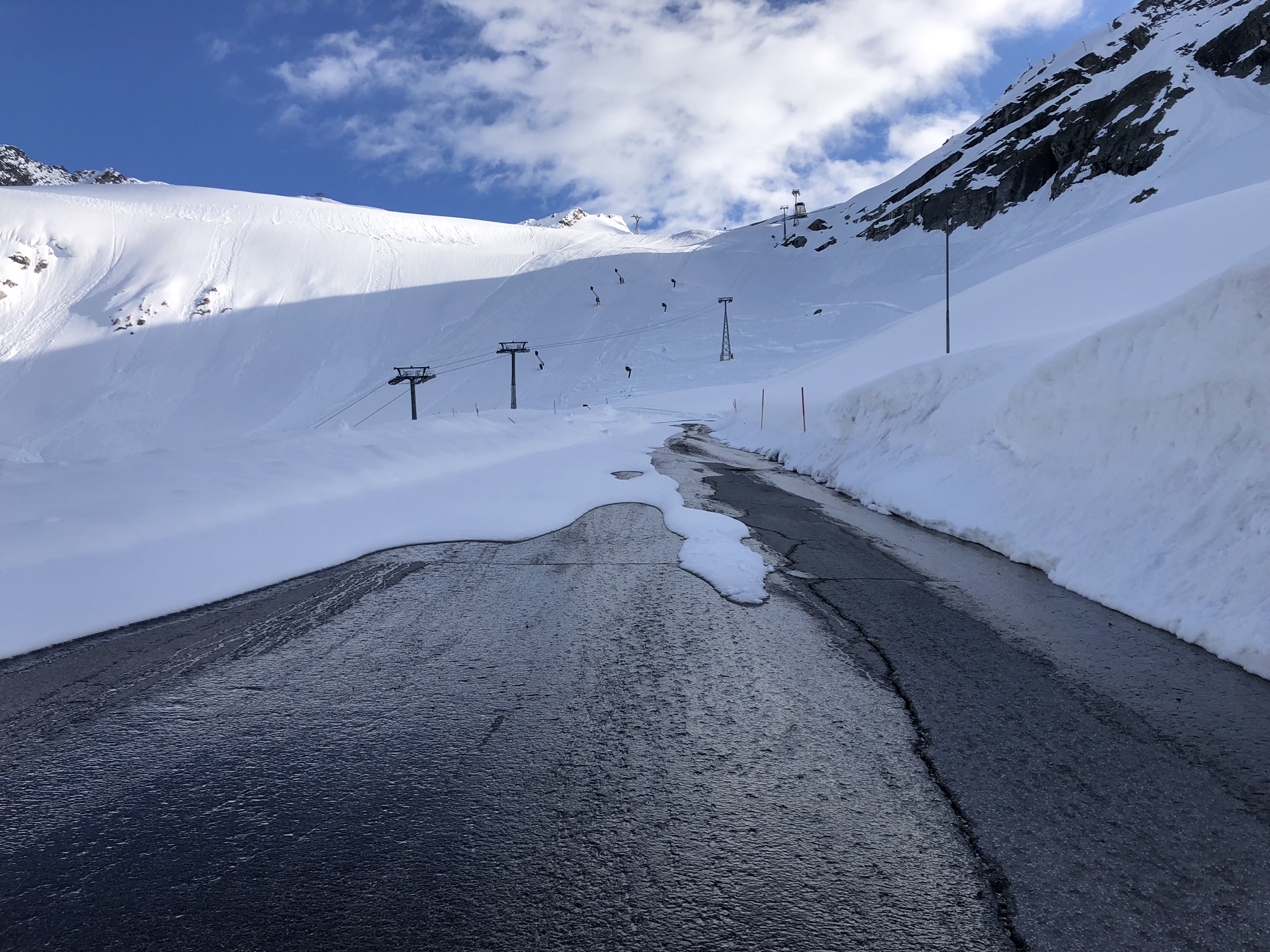 Vanuit Sölden starten we ons avontuur naar de top van de Timmelsjoch (deze kant dalen de deelnemers van de ORM als laatste af). Wederom schijnt de zon heerlijk en de klim gaat over prima asfalt. De ene kilometer is wat zwaarder dan de andere, maar deze kant is goed te doen. In Zwieselstein is er de mogelijkheid om de Vent in te slaan, maar dat doen we vandaag niet. Na Zwieselstein loopt de weg wat steiler op, maar dit duurt maximaal 1,5km. Er volgt een stuk van een paar kilometer tegen max. 5%. Na Obergurgl loopt de weg weer wat meer op en volgen een paar haarspeldbochten en heb je af en toe een prachtig uitzicht over het dal waar je zojuist doorheen gefietst bent. Na deze sectie komen we aan bij het tolstation en staat er een slagboom over de weg heen met de mededeling dat de weg is gesloten. Van de andere kant van de slagboom komen twee fietsers afgedaald die aangeven dat de klim veilig is en dat het gevaar met name aan de Italiaanse kant is. Aangezien de pas één dezer dagen open gaat en we ook een paar auto’s de slagboom zien open maken en de pas oprijden, besluiten we om verder te rijden naar de top. Eerst volgt een afdaling van 2km om vervolgens nog een pittige laatste 5km naar de top te rijden. Langzaamaan wordt het landschap steeds witter en aangekomen in de laatste 2km rijden we tussen indrukwekkende metershoge sneeuwmuren. Erg tof om eens te ervaren. Onderweg komen we meer fietsers tegen en ook op de top staan een paar fietsers die niet konden wachten tot de pas officieel open ging. Op de top tikken we Italiaans grondgebied aan, gaan we met het bordje op de foto en we dalen weer af naar Sölden.