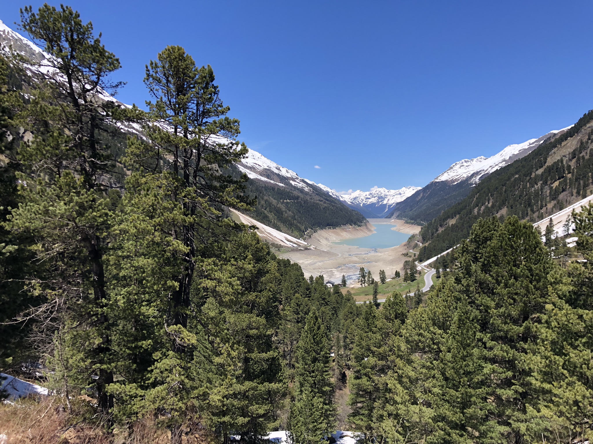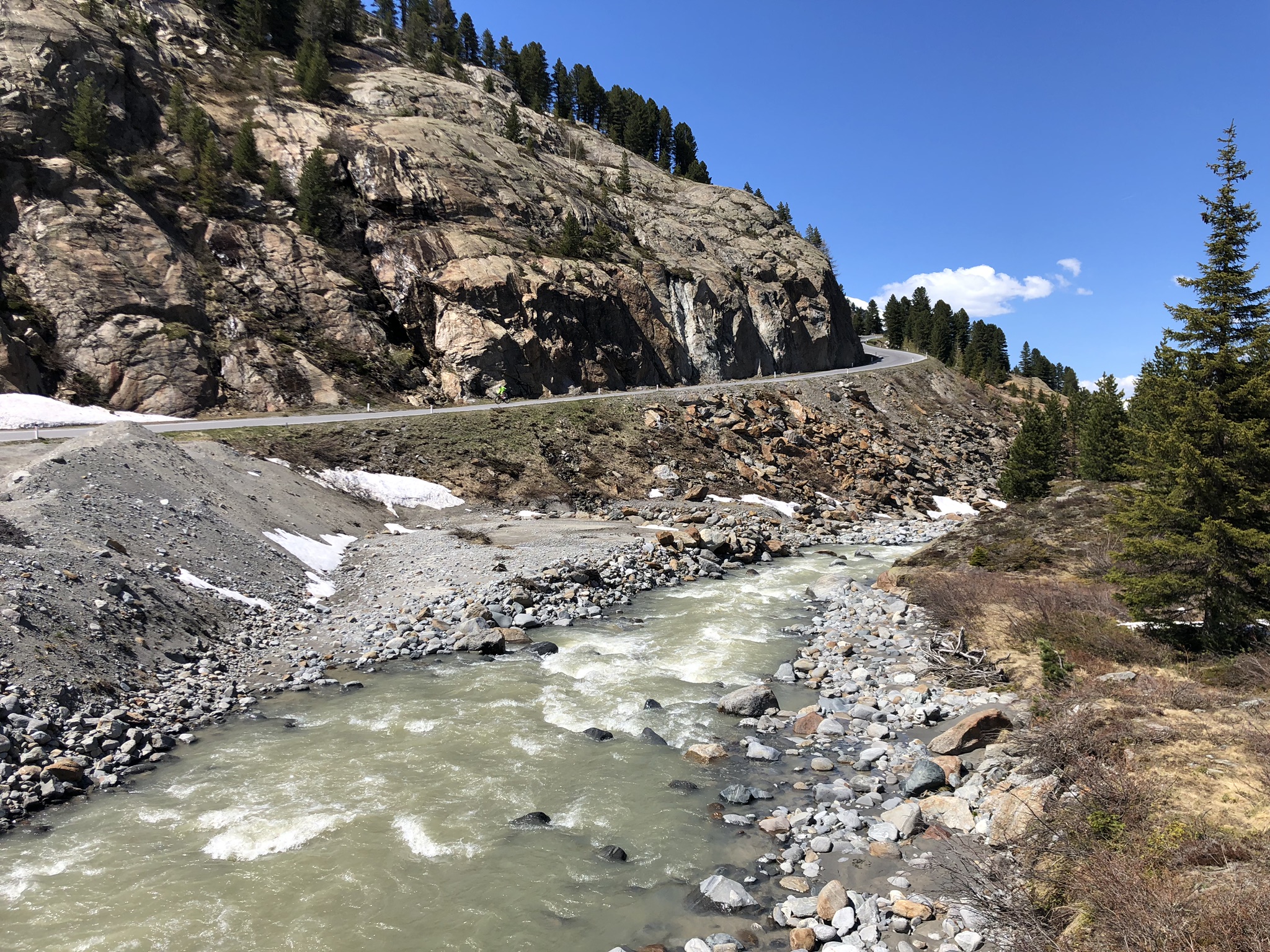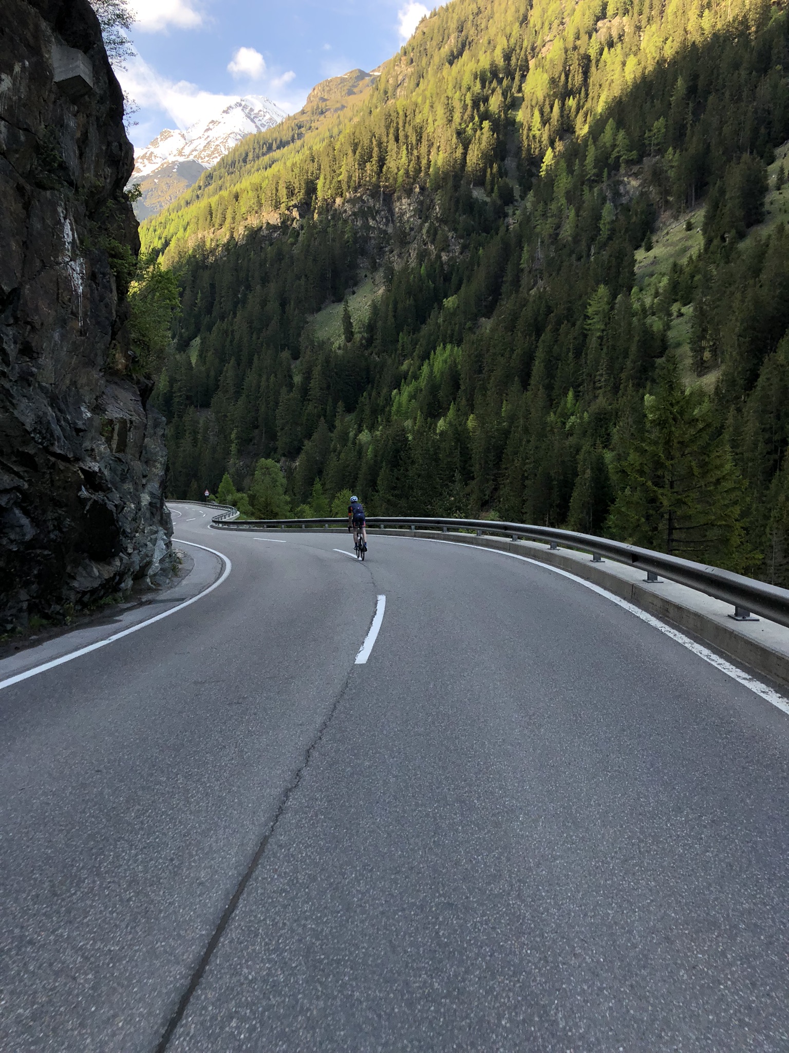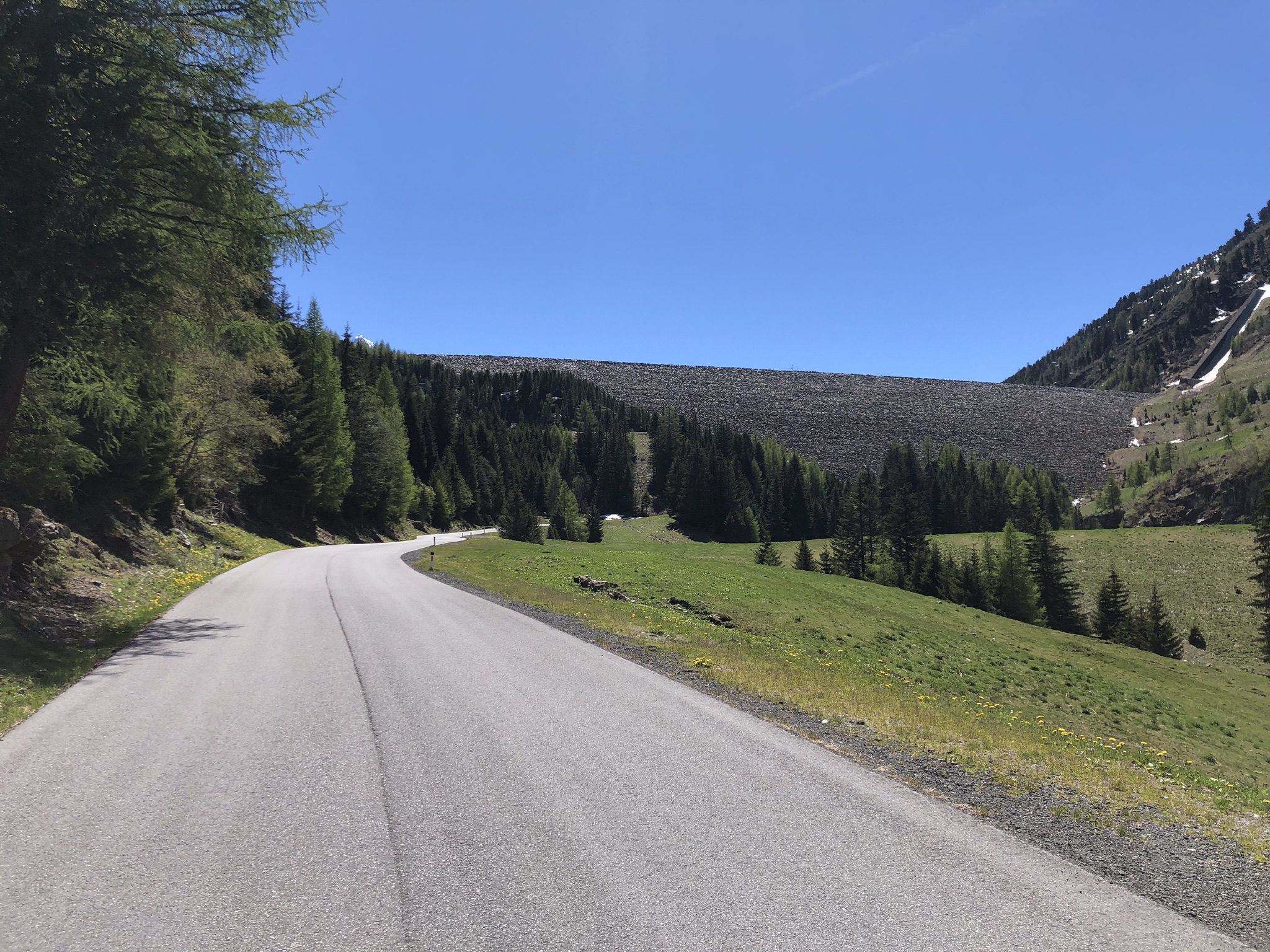 Als we het stuwmeer voorbij zijn, start de klim pas echt en gaan we op eigen tempo verder naar de top. Op 11km van de top staan op het profielkaartje twee kilometers van respectievelijk 5% en 4,5%. Aangezien hier 2 korte afdalingen inzitten steigt de rest tegen de 10% en zijn ze in de praktijk pittiger dan verwacht. Na de tweede mini-afdaling begint de weg weer serieus te steigen en volgt een aardige serie haarspeldbochten, waarbij het uitzicht in iedere bocht mooier wordt. In de verte zie je tussen de bomen door het stuwmeer liggen en kijk je uit over het dal. Hoe hoger we komen hoe minder bomen er staan en hoe meer sneeuw er langs de weg ligt. Een meertje bovenin is nog bevroren en bedekt met sneeuw. Aangezien de strasse geopend is, is het bovenin gezellig druk. Al met al was de klim erg mooi en zeker een aanrader, maar wel pittiger dan het profielkaartje doet vermoeden. Ondanks het gemiddelde stijgingspercentage van 4,9%, klim je in de laatste 12km toch ongeveer 1000 meter, wat een serieuze alpencol is.