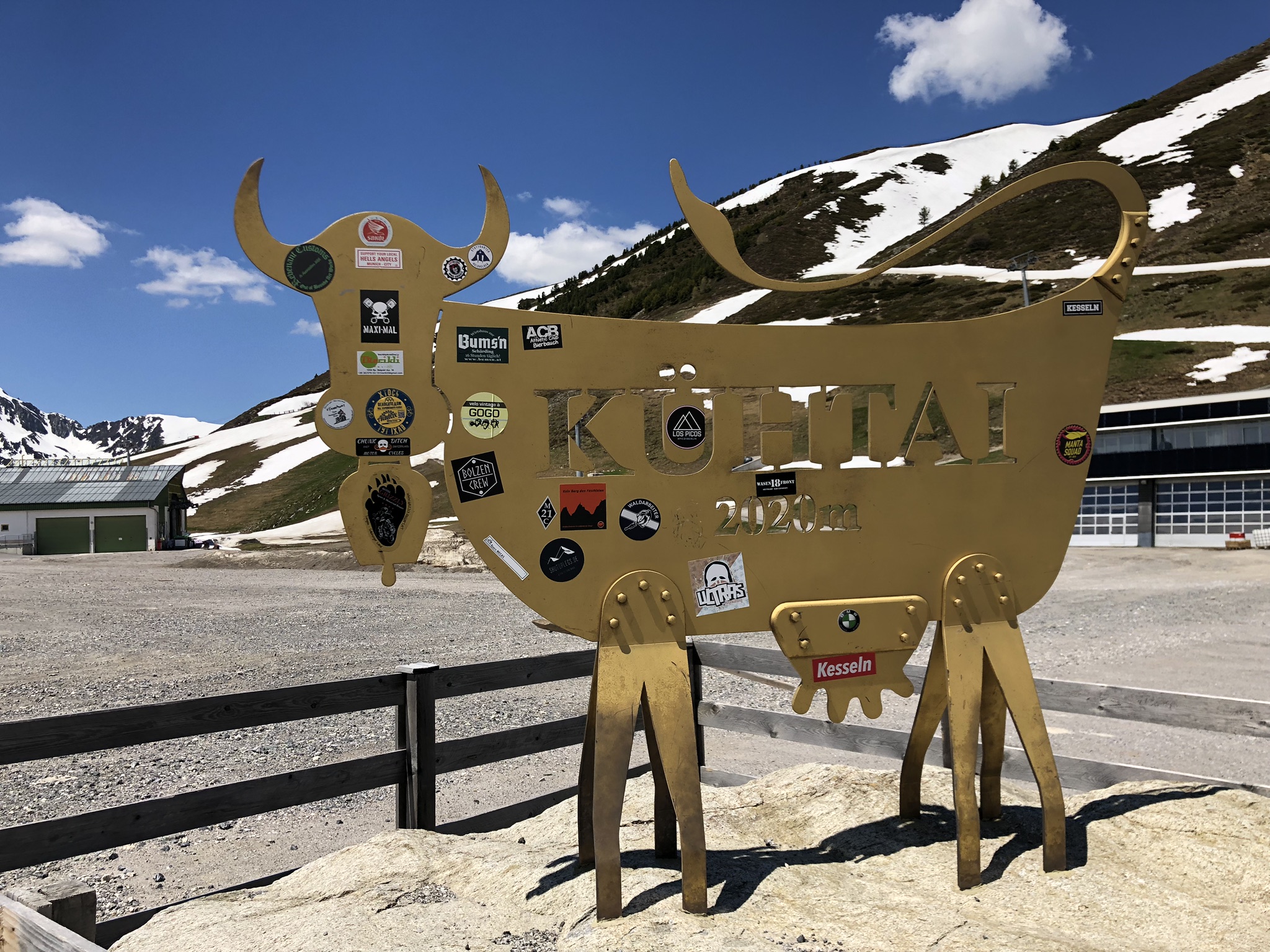 Vanuit Oetz beginnen we koud met het beklimmen van de Kühtai Sattel (ook wel bekend als de eerste klim uit de Ötztaler Radmarathon). De eerste kilometer staat er continu een percentage met twee cijfers op mijn Garmin, dus de benen zijn meteen weer wakker (en doen wat pijn). De Kühtai slingert eerst omhoog boven Oetz en gaat vervolgens het dal in. Ongeveer halverwege volgt een serie haarspeldbochten om vervolgens verder het dal in te schieten. Het eerste deel van de klim is een stuk zwaarder dan het tweede deel. Wel worden we in het tweede deel ter hoogte van de tunnel verrast door een behoorlijk steile kilometer. De laatste 5km lopen lekker door en uiteindelijk komen we in het skidorpje Kühtai bovenop de col. Dit is tevens één van de weinig beklimmingen waar we boven komen en waar ook echt een bordje staat. Heel toepasselijk in de vorm van een koe!
