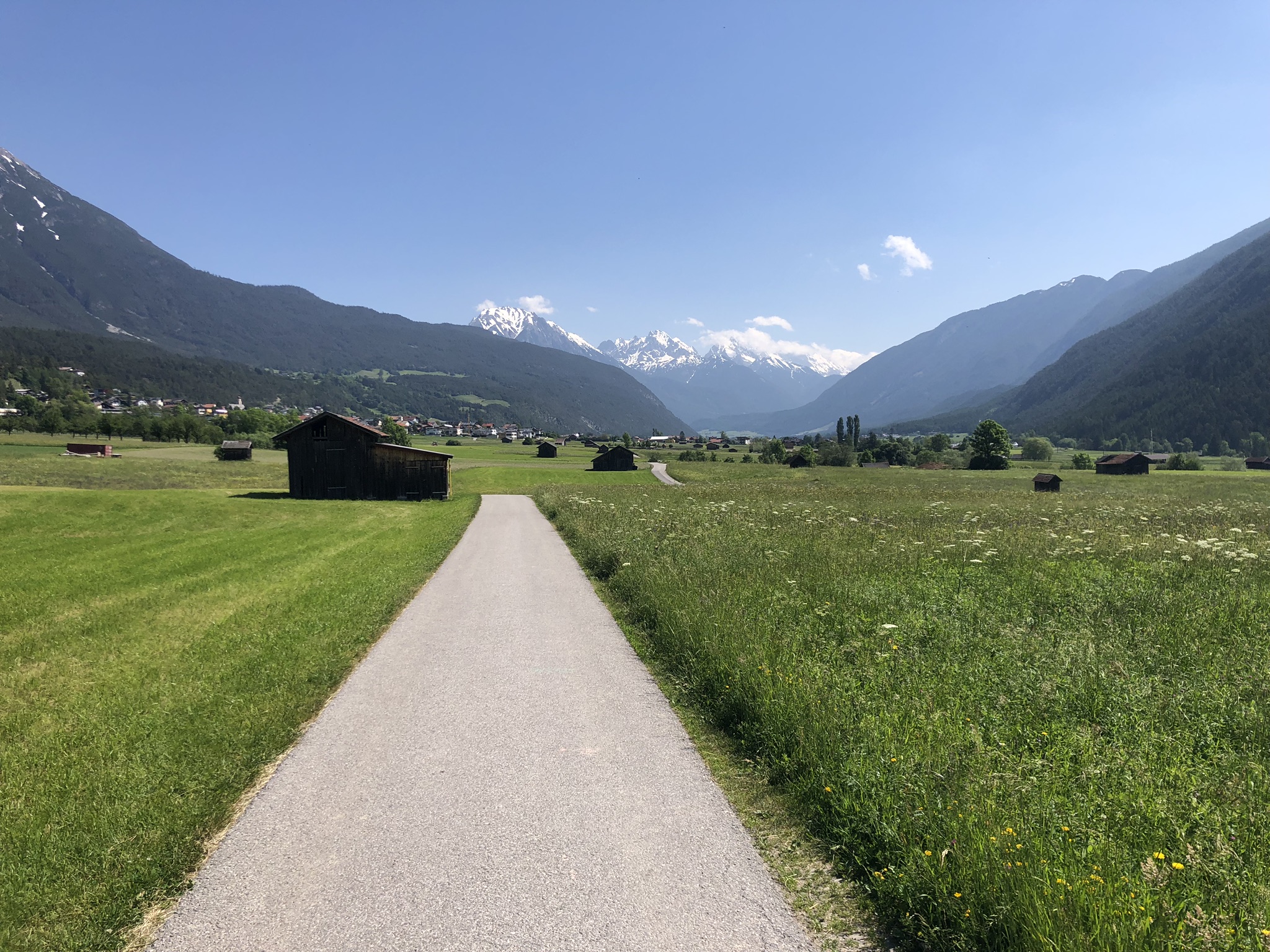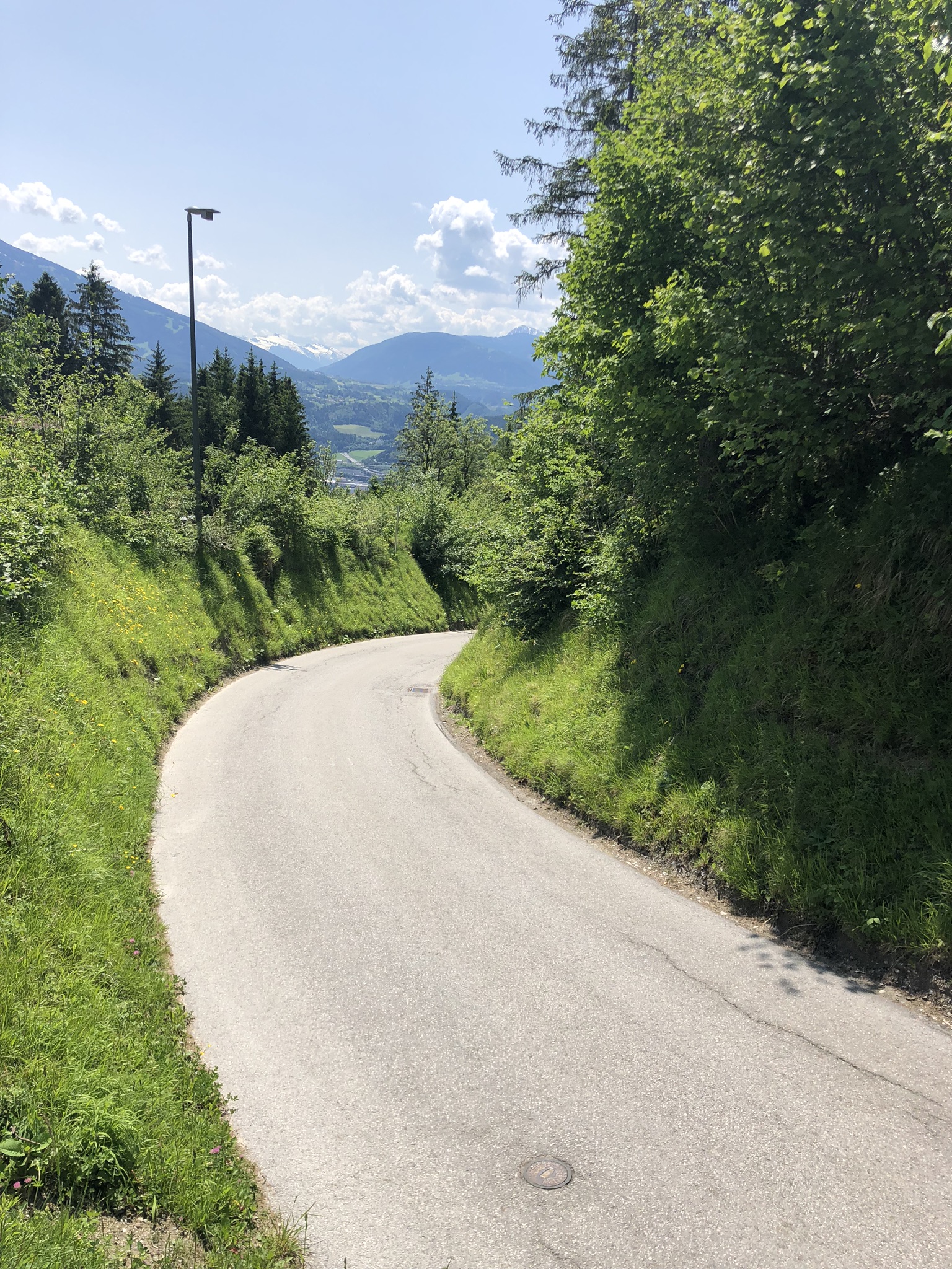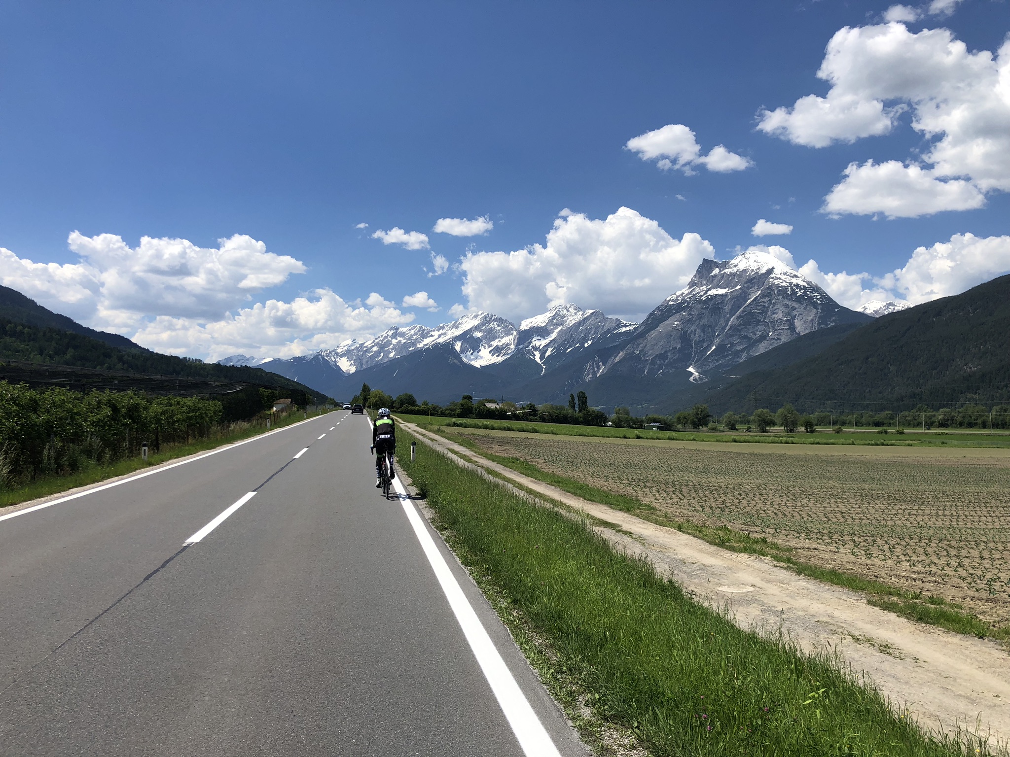 Vervolgens dalen we ruim 23km af naar Kematen in Tirol. De weg is goed en redelijk rechttoe rechtaan met zo nu en dan een bocht(je). Ideaal om goed snelheid te maken zonder veel te hoeven remmen. Halverwege de afdaling krijg ik een klap wind van de zijkant en begint mijn fiets te slingeren (ook wel bekend als shimmy of speed wobble). Best eng om mee te maken, omdat je het gevoel hebt dat je de controle gaat verliezen. Gelukkig krijg ik de fiets op tijd recht en daal ik iets voorzichtiger af. Aangekomen in Kematen volgt een stuk van ruim 30km “vlak”. Af en toe loopt de weg valsplat op of zit er een klein klimmetje in, maar hier schieten de kilometers lekker op.