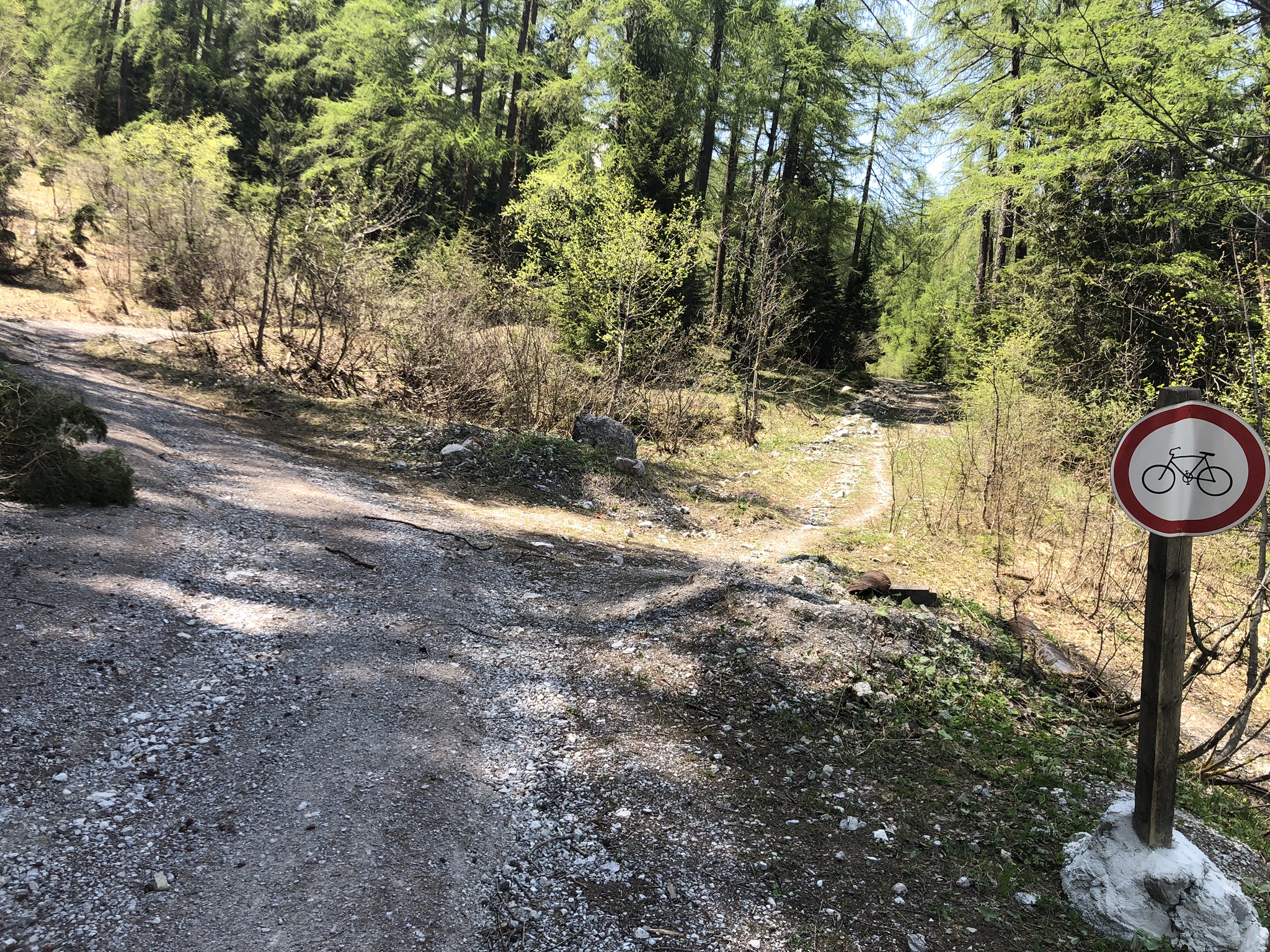 Na deze muur kom ik weer meer tussen de bomen te fietsen en zie ik al snel weer percentages van 15-17% op mijn Garmin staan. Ruim een kilometer voor de top (als de haarspeldbochten ongeveer moeten komen) wacht me een nieuwe verrassing. Vanaf hier is de klim naar de top namelijk onverhard. Het gravelpad ziet er in eerste instantie OK uit, maar de strook naar de eerste bocht loopt al snel op tot boven de 20%. Staan gaat hier niet, omdat dan mijn achterwiel wegslipt, dus hangend naar voren zoek ik een weg naar boven. Soms verlies ik grip op mijn achterwiel en spint deze door als ik over een slecht stuk rijd. Ik probeer zoveel mogelijk over de harde stukken grind te rijden, maar omdat het tempo laag is, zwalk ik een beetje en kom ik soms op lossere stukken terecht. Zonder een voetje aan de grond overleef ik de eerste steile strook. De stukken tussen de haarspeldbochten zijn wat beter te doen, omdat het percentage hier “maar” 12-15% is. Even later komt er een nieuwe steile strook van tegen de 20% aan. Deze gaat net zo moeilijk als de vorige strook met als verschil dat ik hier wel een voetje aan de grond moet zetten na een stuurfout. Opstappen zit er hier niet bij, dus ik loop 50 meter tot de volgende bocht. Vanaf hier zet ik koers richting de top en doemt dan eindelijk het Herrenhäuser op. Ik ben boven! Ik fiets nog achter het pand langs en het pad lijkt verder te lopen, maar gelukkig staat er een bordje dat het vanaf hier niet meer toegestaan is om te fietsen. Deze keer besluit ik me maar aan de regels te houden :). De afdaling is een stuk minder leuk, aangezien ik geen schijfremmen heb. Door het stijgingspercentage van de weg (en een deel is ook nog eens onverhard) kan ik niet teveel snelheid maken, wat betekent dat ik flink moet remmen. Het gevolg is dat mijn velgen steeds heet worden en omdat ik geen zin heb in een klapband stop ik zo nu en dan om mijn velgen af te laten koelen. Uiteindelijk kom ik heelhuids beneden en vervolgen we onze weg naar de Hinterhorn Alm.