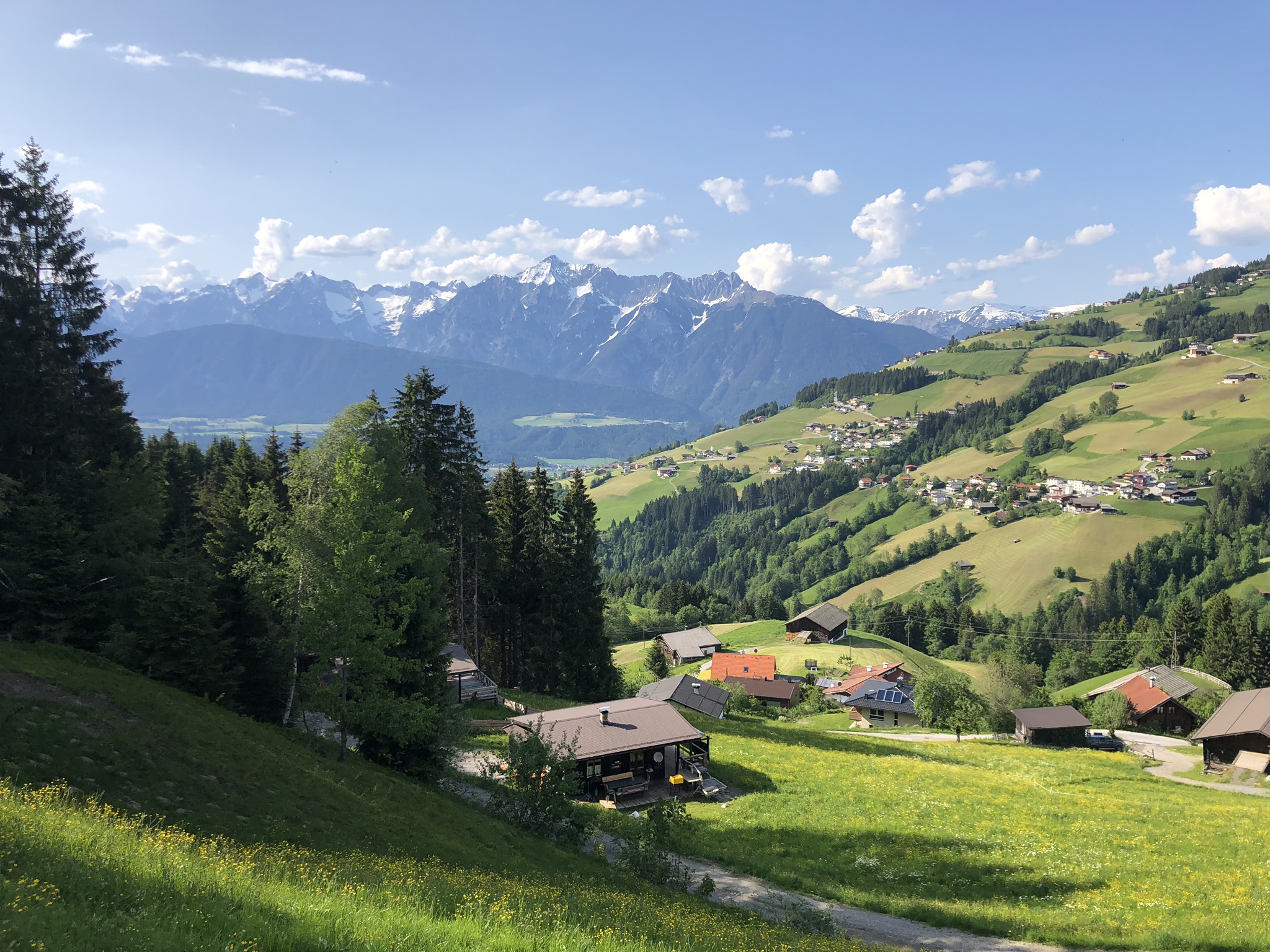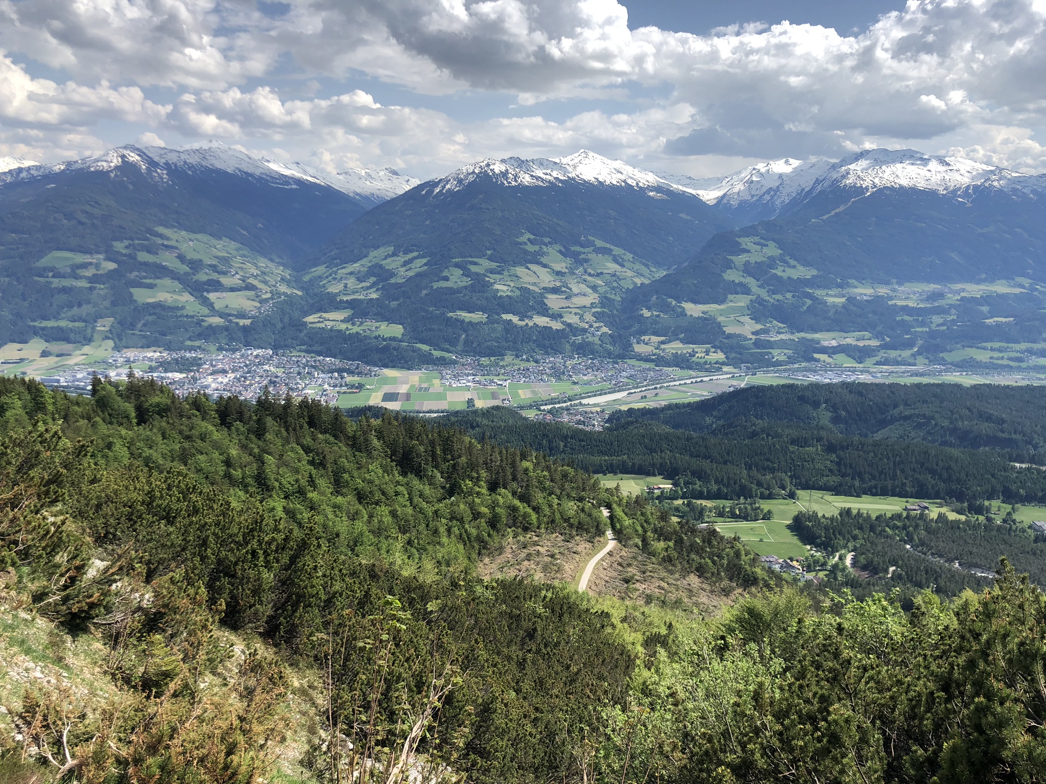 Vanaf de onderkant van het steile stuk van de Halltal begint de Hinterhorn Alm al volgens het hoogteprofiel, maar de eerste 3km voelen niet echt als een klim aan, omdat je hier eigenlijk door het dal fietst. Pas als we in Sankt Martin linksaf slaan begint de klim echt en is het nog 6km tot de top met een gemiddelde van bijna 11%. Dit stuk is ook het parkoers van de jaarlijkse Hinterhorn Challenge waarbij er een wedstrijd wordt georganiseerd wie er als snelste naar boven fietst. Waar ik op de Halltal geen enkele fietser tegen ben gekomen, kom ik er hier meerdere tegen die zowel omhoog als omlaag gaan. Ondanks het stijgingspercentage en de hitte, loopt de klim lekker gelijkmatig en heb ik voor de eerste keer vandaag het gevoel dat ik in een ritme kan komen. Hoe hoger ik kom, hoe mooier het uitzicht over het Inntal wordt. Bovenop zit een restaurant die geopend is. Ik heb honger en zin in iets anders dan zoets, maar ik besluit direct om te draaien en af te dalen en ergens voor de volgende klim te eten.