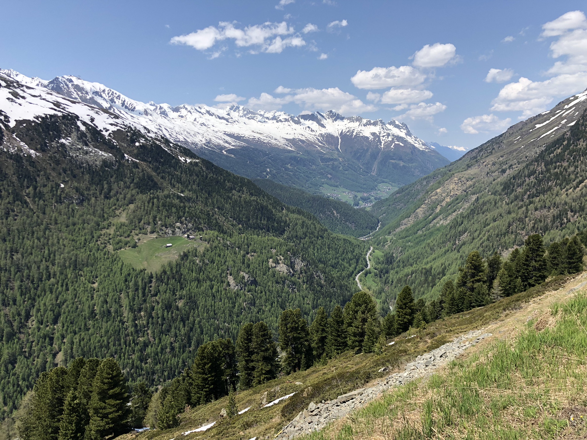 De klim is vanaf het begin regelmatig en steil. Enkel bij het tolstation vlakt de weg wat af, om vervolgens weer net zo steil door te lopen. Eenmaal bij het tolstation aangekomen ziet het er erg verlaten uit. Gelukkig kan ik er met de fiets langs om de weg verder omhoog te vervolgen. Waar het eerste deel van de klim nog boven Sölden slingert (na 3km kun je overigens de afslag naar Hochsölden nemen), schiet de klim na het tolstation een ander dal in. Aan de hoeveelheid sneeuw merk ik dat ik steeds hoger kom. Gestaag klim ik verder tot ik in de verte sneeuw over het wegdek zie liggen. Door de felle zon heeft een sneeuwmuur het begeven en ligt er over een lengte van 30 meter sneeuw over de weg. Aangezien het nog 3km fietsen is naar de top, besluit ik een stukje door de sneeuw te lopen. Ondanks dat mijn voeten er ver in weg zakken en nat worden, gaat dit verder prima. Na het stukje klunen stap ik weer op en fiets ik verder. Even later kom ik aan bij de skilift, waar de weg opsplitst naar de Tiefenbachferner en Rettenbachferner. Aangezien de weg naar de Tiefenbachferner nog is afgesloten en nog helemaal vol ligt met sneeuw, fiets ik verder richting de Rettenbachferner. Een kilometer voor de top stopt mijn avontuur. Gezien de grote hoeveelheden sneeuw op de berg en het wegdek besluit ik hier om te draaien omdat het vanaf dit punt niet veilig meer voelt en ik geen zin heb om tussen de sneeuw door naar de top te zigzaggen. Desondanks heb ik een uitdagende klim gereden door een prachtig landschap. Omdat de weg voor auto’s was afgesloten was het lekker rustig. Wat volgt is een heerlijke afdaling naar Sölden en vervolgens door het Ötztal richting het appartement om af te sluiten met de klim naar Gries.