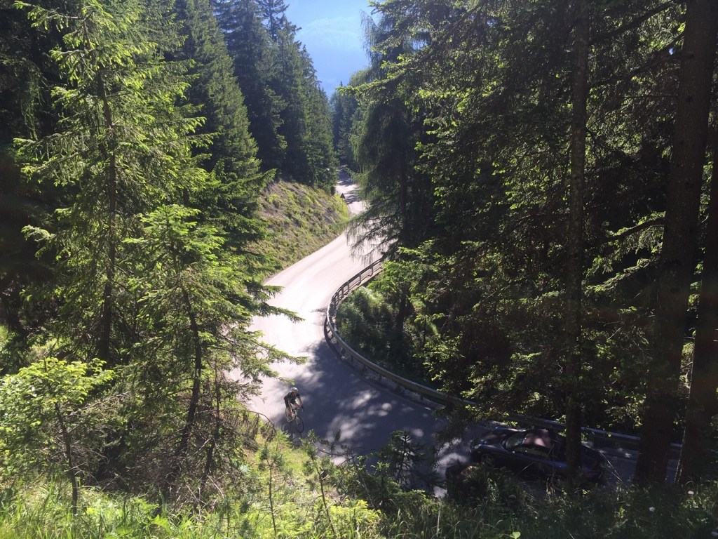 We parkeren onze auto vlakbij Lienz na een uur en een kwartier te hebben gereden. We rijden eerst richting de Dolomitenhütte. We komen veel locals tegen in klederdracht en blijkbaar is het Sacramentsdag, een nationale feestdag. Richting de eerste klim komen we een paar profrenners tegen van Trek, maar wie het zijn zien we niet (ook niet achteraf op Strava). De Dolomitenhütte voert (zoals de naam het al zegt naar een berghut. Je fietst hierbij grotendeels door een bos met de aankomst op een parkeerplaats waar het verrassend druk is. Op weg naar boven rijdt er continu een man op een elektrische mountainbike achter me en mijn doel op deze klim is deze voor te blijven. Dat lukt en moe maar voldaan kom ik boven. Omdat het de eerste beklimming van de dag was ging het vrij soepel, maar het is toch 7,5km behoorlijk aanpoten. In de afdaling is het opletten op de schuine afwateringsgoten in het wegdek. Het nadeel van steile beklimmingen is dat ze vaak niet over de breedste en strakke wegen liggen en dat het bij een bochtig parcours veel remmen is. Zeker met velgremmen moet je dan oppassen dat het niet allemaal te heet wordt.