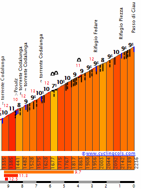 | Passo di Giau | 9,5km | 9,5% | 901 | 2236m |