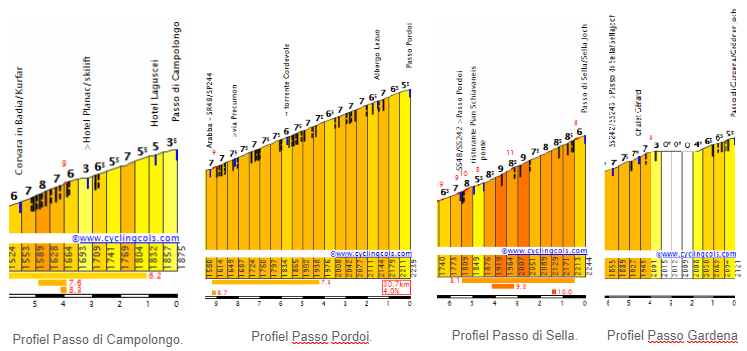 | Passo Campolongo (2x) | 6km | 5,9% | 351 | 1875m |