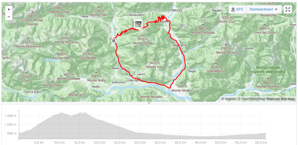 Eenmaal boven zijn we heel blij deze supervette klim af te kunnen vinken. We krijgen applaus van een motard en dalen vervolgens aan de andere kant af richting Sutrio. De eerste paar kilometer zijn steil en de weg is er ook wat smaller. We dalen rustig af en toch mis ik bijna een bocht. Wat verder naar beneden zijn de percentages wat prettiger om af te dalen en wordt de weg ook breder. Door het dal rijden we vervolgens met de klok mee om de bergtoppen heen over de SS52 en is het verder eenvoudig fietsen. Het zijn wat grotere wegen en daarmee is het niet de fraaiste route. Beter was het misschien om de SP21 te nemen en binnendoor over de kronkelweggetjes een extra klim mee te pikken. Maar ach, we hebben de Zoncolan gereden, dus onze dag kan niet meer stuk!
