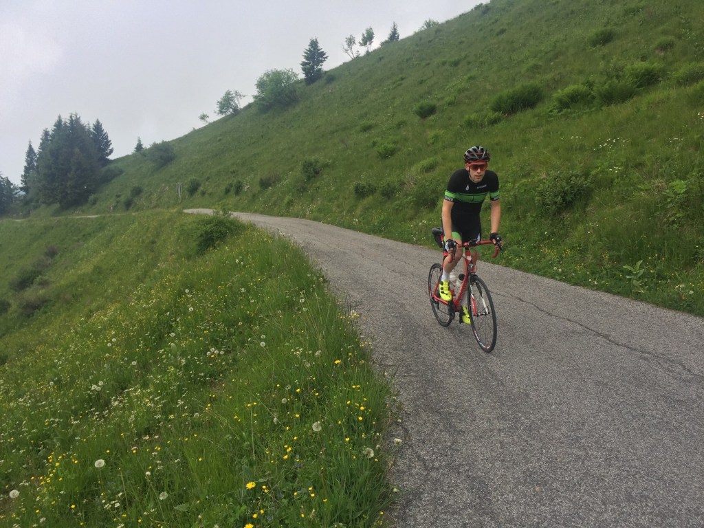 Eenmaal op het asfalt geniet ik van een soepele afdaling terug naar Longega. Hier fiets ik door naar de Passo delle Erbe. Vanuit het Oosten kun je op twee manieren naar de top. De klim start over een brede asfalt weg en gaat na een paar kilometer over een smallere weg verder. Ook deze klim is lastig met continu percentages van 10% of hoger, op een stukje afdaling halverwege na, waardoor het gemiddelde percentage doet vermoeden dat de klim makkelijker is. De benen zijn na een weekje kuitenbijten niet heel fris meer, maar het geeft toch moraal dat het het laatste lijden van de fietsvakantie is. Vijf kilometer voor de top kom ik weer op een grotere weg, waar het druk is met motorrijders. Aangekomen op de top trek ik mijn jasje aan en rijdt via de grote weg naar San Martin de Tor en vanuit daar fiets ik door het dal vals plat naar beneden naar de auto.