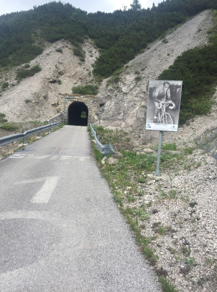 Na 8 kilometer en een uur onderweg, heb ik al meer dan 1000 hoogtemeters op mijn Garmin staan. Zonder een voetje aan de grond te zetten volbreng ik de steile hel en kan ik uitrusten op een kilometer 8% die aanvoelt als vlak. Richting de top is de klim meer open en volgt een tunnel. Ik groet Pantani en Merckx en ben blij dat ik bijna boven ben. Het laatste stuk is ook nog aardig steil, maar de top lonkt en ik ben blij en opgelucht tegelijk als ik boven ben. Ik eet even iets en daal een paar kilometer af om Thomas op te pikken en fiets met hem omhoog.
