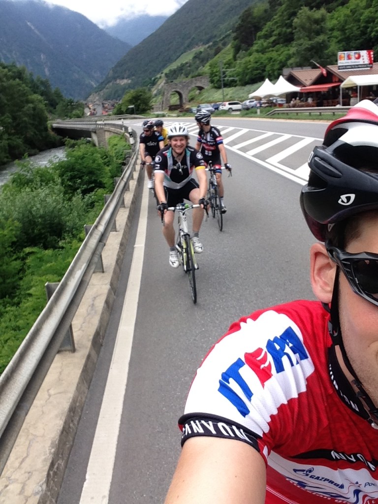 Eenmaal boven doen we ons windjack aan en rijden we Italië in op weg naar Aosta. De afdaling ligt er goed bij, maar al snel begint het hard te regenen en zijn we doorweekt. Op de top was het 4 graden, dus het is geen pretje om nat af te dalen. Onze lichamen koelen snel af door de combinatie van nat en kou en klappertandend en trillend dalen we af. Dalen is dit keer zeker geen beloning. Na 17km afdalen besluiten we dat het genoeg is geweest en vluchten we een verlaten restaurantje in. We trekken onze natte kleding grotendeels uit en hangen die over de verwarming. De eigenaar schotelt ons thee en stokbrood met anti pasti voor. Drie kwartier warmen we op en tanken we bij om vervolgens onze natte spullen weer aan te trekken. We dalen niet verder af en starten direct met klimmen. Hierdoor krijgen we het gelukkig snel warm! We kijken erg op tegen de ruim 40km lange afdaling aan de andere kant. Onze kleding is nog steeds nat, maar gelukkig is het wel droog. Na 17km klimmen komen we boven, gaat het regenjack aan en beginnen we aan de afdaling. Helaas begint het aan de andere kant te regenen. We moeten er toch echt doorheen om bij de auto te komen. De eerste 6km koelen we snel weer af en gaan we trillend van de kou van bocht naar bocht. Na het steile stuk komen de wegen die wat meer rechtdoor gaan en kunnen we nog een beetje meetrappen om het warm te krijgen. Hier komt helaas ook het autoverkeer er weer bij. Het zicht is slecht en er volgt een lange tunnel. Gelukkig zit hier een bus achter ons ‘vast’ en houdt die het andere verkeer achter ons zodat er geen gevaarlijke situaties ontstaan. Uiteindelijk redden we het tot beneden en gaan we kapot van de kou. Snel de fietsen op het dak, de auto in en de kachel zo hoog als het maar kan.