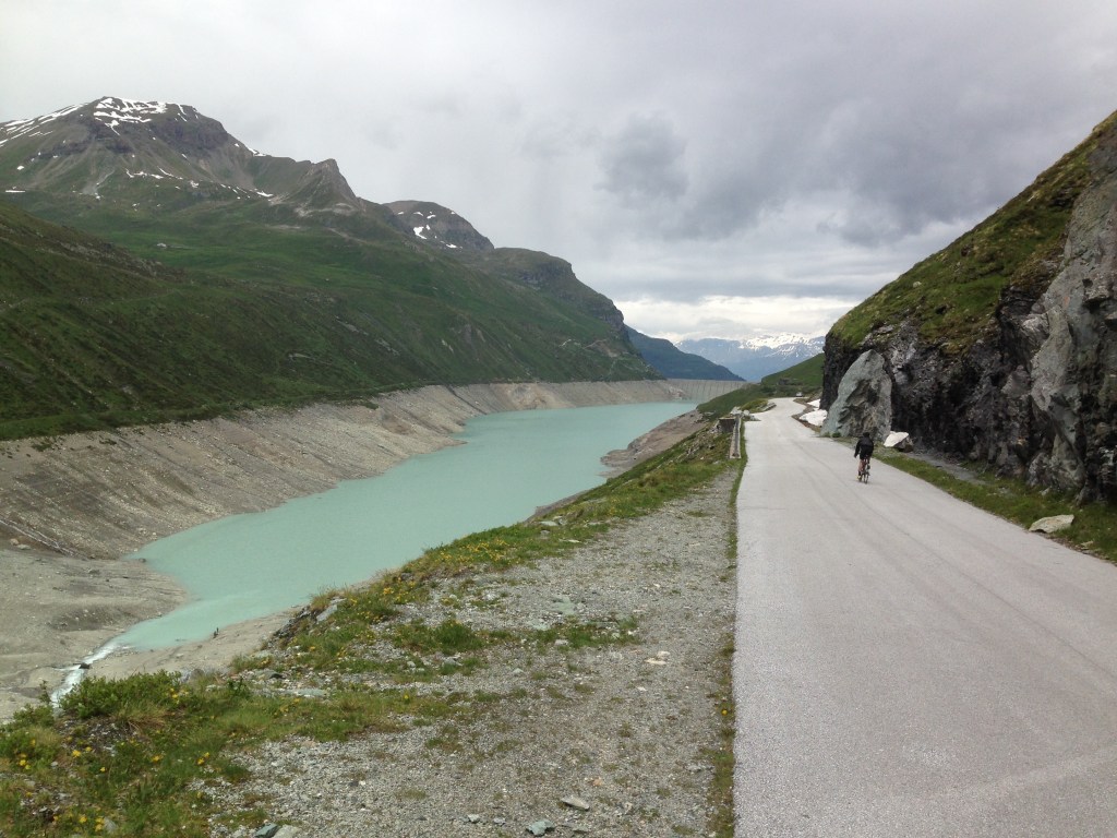 Het voordeel van hoog slapen is dat je niet meteen begint met klimmen. In plaats daarvan starten we met een afdaling over heerlijk asfalt. Beneden aangekomen rijden we aan de andere kant van het zijdal waarin we slapen (Val d’Hérémence) weer terug en loopt het wegdek meteen aardig omhoog. De weg naar de top is lang vanuit hier, maar de eerste 10 kilometer lopen lekker gelijkmatig omhoog. Daarna vlakt de klim wat af en sluit af met 4km tegen 10% slingerend tussen de bomen. Eenmaal boven gekomen fiets je letterlijk tegen een enorme muur op en heb je de stuwdam bereikt.